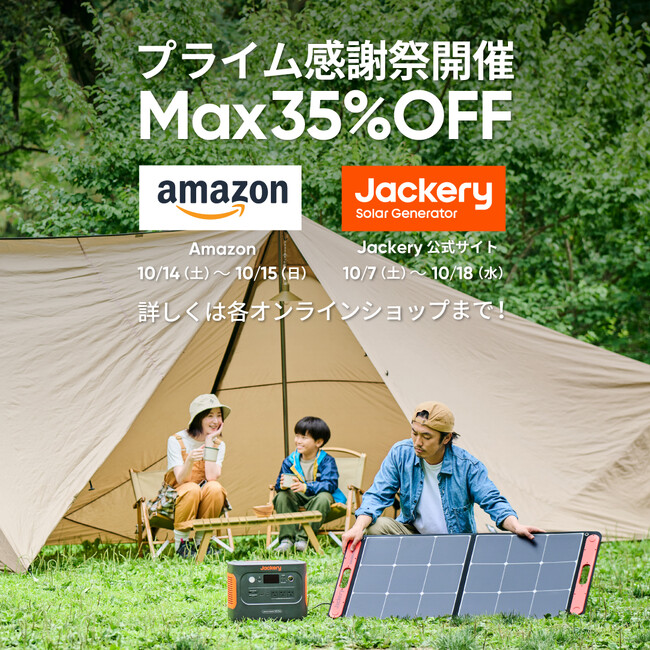 ポータブル電源・ソーラーパネルの世界的リーディングカンパニー・Jackeryの日本法人である株式会社Jackery Japan(所在地:東京都港区)は、2023年月10月14日(土)0時から15日(日)23時59分までの48時間にわたって開催される「Amazonプライム感謝祭」において、ポータブル電源とソーラーパネルが最大35%オフとなる、特別割引セールを開催します。また、10月7日(土)~10月18日(水)の期間中、公式サイトも同時に最大35%オフのセールを予定しております。その他に、Jackery Japan公式X(旧Twitter)及びInstagramアカウントでポータブル電源 300 Plusをプレゼントするキャンペーンも同時に実施します。