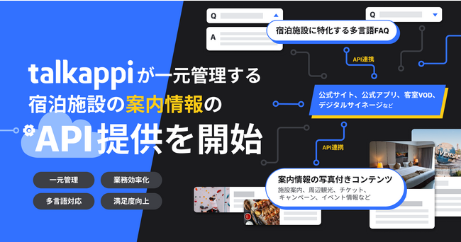 観光分野のDXを推進する株式会社アクティバリューズ(東京都渋谷区)は、2023年10月10日から、顧客体験プラットフォーム「talkappi(トーカッピ)」で一元管理する宿泊施設の案内情報を、外部システムへのAPI連携による提供を開始しました。これにより、AIチャットボットや旅ナカアプリ「VERY」を含むtalkappiの各種サービスだけでなく、ホテル・旅館の公式サイト、公式アプリ、デジタルサイネージ、客室VODなど、多様な外部システムもAPIで宿泊施設の案内情報を取得し、活用できるようになります。この取り組みにより、宿泊施設様の情報更新と管理が簡素化され、案内情報の一貫性が確保されます。また、お客様からのお問い合わせが減少することも期待されます。