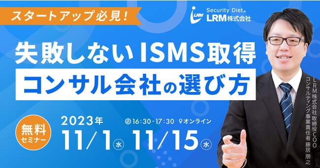 LRM株式会社(以下LRM、本社:兵庫県神戸市、代表取締役CEO:幸松哲也)は、2023年11月1日(水)・15日(水)の2日程で、「スタートアップ必見!失敗しないISMS取得コンサル会社の選び方」のオンラインセミナーを開催いたします。