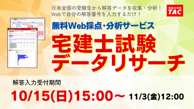 宅建士試験対策講座を展開しているTAC株式会社(東京都千代田区、代表取締役:多田敏男)は、10/15(日)に実施される『令和5年度宅建試験(宅地建物取引士試験)』の解答速報を試験当日にTACのWebサイトで公開いたします。