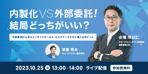 2023年10月25日(水)13:00~14:00よりZOOMにて【営業、マーケティング、経営企画部門の方向け】「インサイドセールス/カスタマーサクセス 内製化vs外部委託 ~失敗事例から学ぶ導入のポイント~」について語るウェビナーを開催いたします。