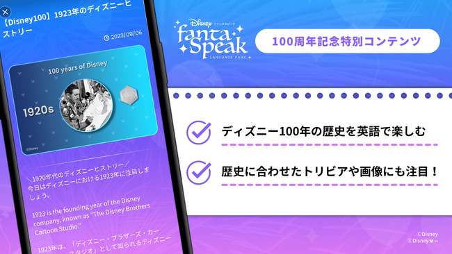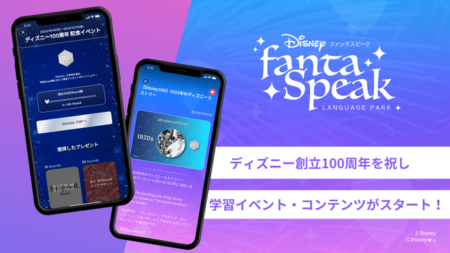 株式会社アルク(東京都千代田区 代表取締役社長:天野 智之、以下アルク)は、ウォルト・ディズニー・ジャパン株式会社監修の英語・英会話アプリ「ディズニー ファンタスピーク」で、ディズニー創立100周年を祝し、スペシャルな学習イベントや、ディズニー100周年の歴史を英語で楽しむ、100日連続の限定コンテンツを配信しています。