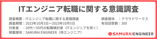 プログラミングスクール「SAMURAI ENGINEER(侍エンジニア)」を運営する株式会社SAMURAI(本社所在地:東京都千代田区、代表取締役 :高比良 直人、以下:当社)は、ITエンジニアを除く転職検討者20~50代の男女300名を対象に実施した「ITエンジニア転職に関する意識調査」の結果を発表いたします。