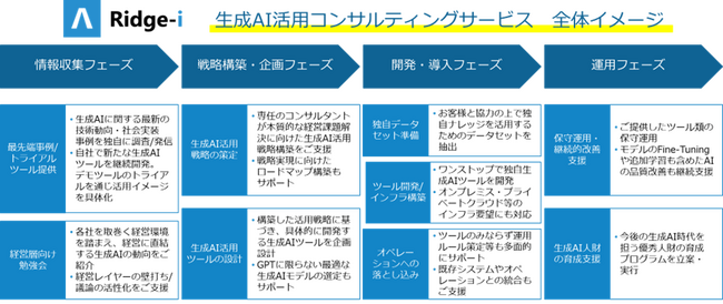 (※1)弊社プレスリリース Ridge-iが生成AI活用コンサルティングサービスを開始 ~戦略構築からシステムの設計開発、人財育成に至るまで ワンストップでサービスを提供~( (リンク ») )(2023年7月12日)
