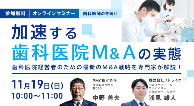 急速に増えるM&Aは歯科業界にまで広がっております。「地域医療のために閉院は出来ないが後継者がいない」、「スピード感を持って歯科医院の規模拡大を図りたい」などのお悩みはM&Aで解決できる可能性があり、戦略的に検討する必要があります。全国で約600医院もの歯科医院コンサルティングを行うPMC株式会社の中野善夫会長と、歯科医院のM&Aを数多く手掛ける株式会社ストライクのアドバイザーが、歯科医院経営者が考えるべき戦略的M&Aについて解説します!