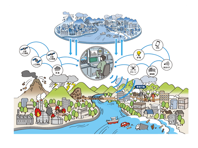 戦略的イノベーション創造プログラム(SIP)第3期における課題「スマート防災ネットワークの構築」では、巨大地震や頻発化・激甚化する風水害等に対し、企業・市町村の対応力の強化、国民一人ひとりの命を守る防災行動、関係機関による迅速かつ的確な災害対応を実現するとともに、社会全体の被害軽減や早期復興を図ることを目指し、「災害対応を支える情報収集・把握の高度化」と「情報分析結果に基づいた個人・自治体・企業による災害への対応力の強化」の研究開発に取り組みます。