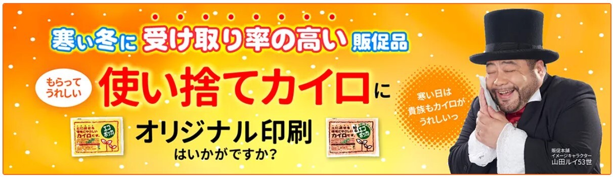 広告入りカイロ、広告を印刷したカイロなど、販促用カイロを幅広く取り扱っているほか、カイロのみでもご購入いただけます。