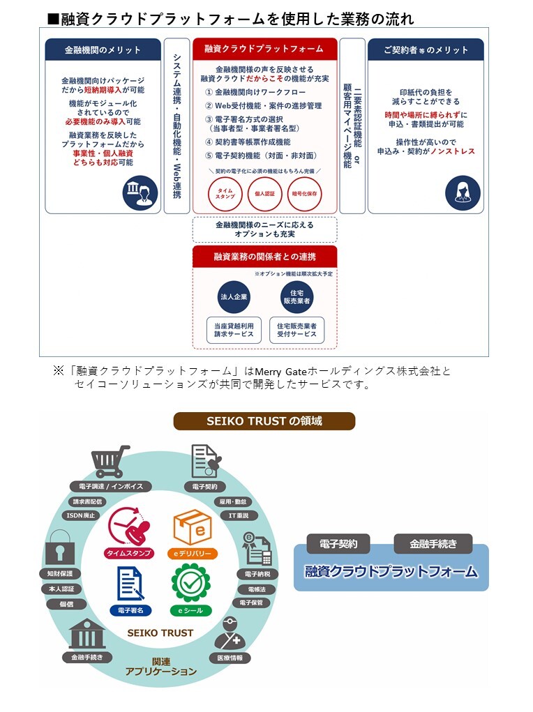 セイコーソリューションズは、「融資クラウドプラットフォーム」を含めた電子契約をはじめ、流通する電子データの信頼性を保証するサービス全般を「SEIKO TRUST」(※別添参照)として展開しています。今後も、脱ハンコ、テレワークといった社会情勢の変化やお客さまのニーズにあわせ、サービスの拡充を図り、企業の継続的な成長を積極的に支援していきます。