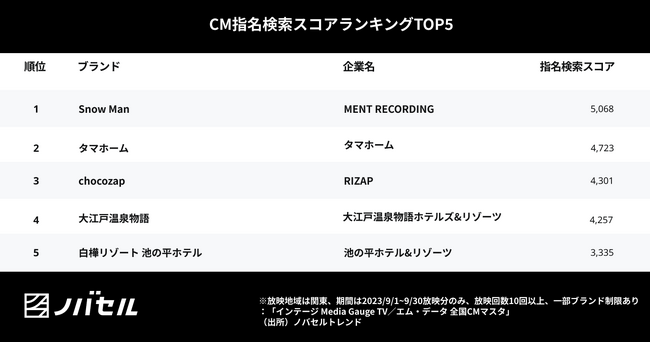 マーケティング情報の発信拠点となる「ノバセル オープンラボ」を運営するノバセル株式会社(本社:東京都品川区、代表取締役社長:田部正樹、以下ノバセル)は、テレビCM効果の分析サービス「ノバセル トレンド」を活用し、2023年9月に放映されたテレビCMの指名検索スコアランキングを発表いたします。