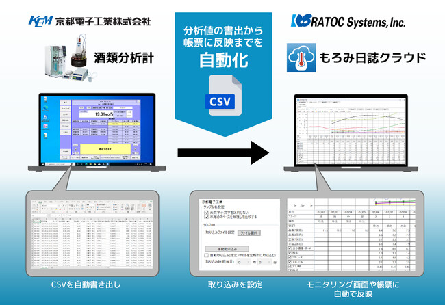 ラトックシステム株式会社(本社:大阪市、代表取締役社長:近藤 正和、以下「ラトックシステム」)は、酒造向けシステム「もろみ日誌クラウド」の機能を本日付でアップデートしました。今回のアップデートにより、京都電子工業株式会社(本社:京都市、代表取締役社長:岸本 京子、以下「京都電子工業」)が提供する酒類分析計の自動データ取り込みが可能となります。