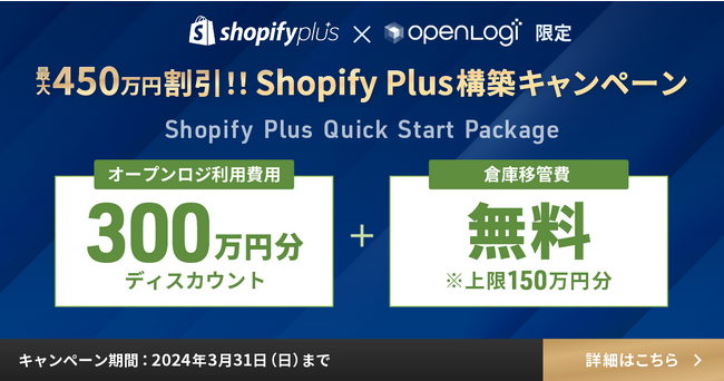 この度、オープンロジは、Shopify Japan株式会社(本社:東京都渋谷区、カントリーマネージャー:太原 真、以下:Shopify Japan)と共同で、Shopify PlusでEC構築した事業者、または既存ECをShopify Plusでリプレイスした事業者で、初めてオープンロジを利用するユーザーを対象に、利用料金最大450万円割引する「Shopify Plus Quick Start Package」を2023年11月1日から実施いたします。