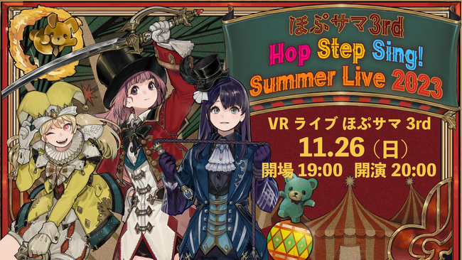 VRアイドル「Hop Step Sing!」が、待望のVRライブ「ほぷサマ3rd」を11月26日(日)に開催します。3回目を迎える「ほぷサマ」。これまで新しい驚きと感動を届けてきた「ほぷサマ」が今回チャレンジするのは、なんと冒険活劇。呪われた村を救うために立ち上がった伝説の勇者を、虹川仁衣菜(CV:指出毬亜)、椎柴識理(CV:鳥部万里子)、箕輪みかさ(CV:日岡なつみ)が演じます。もちろん新曲も含めた歌や踊り、そしてトークも盛りだくさん。冒険に参加するプレーヤーたちも彼女たちと一緒に歌い、踊り、そして平和のために戦います。