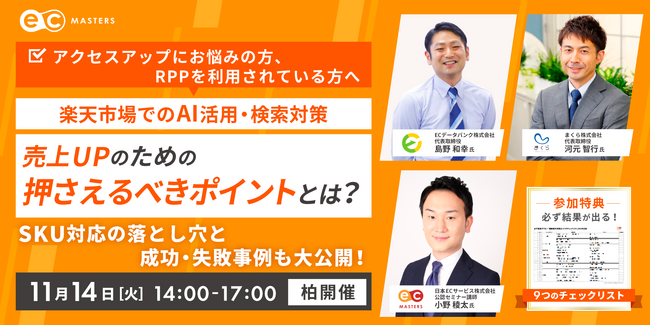 日本ECサービス株式会社(本社:東京都渋谷区、代表取締役:清水将平)は、ECデータバンク株式会社 代表取締役 島野和幸氏、まくら株式会社 代表取締役 河元智行氏をお招きして、楽天ショップのAI活用、検索対策セミナーを2023年11月14日(火)に柏で開催します。