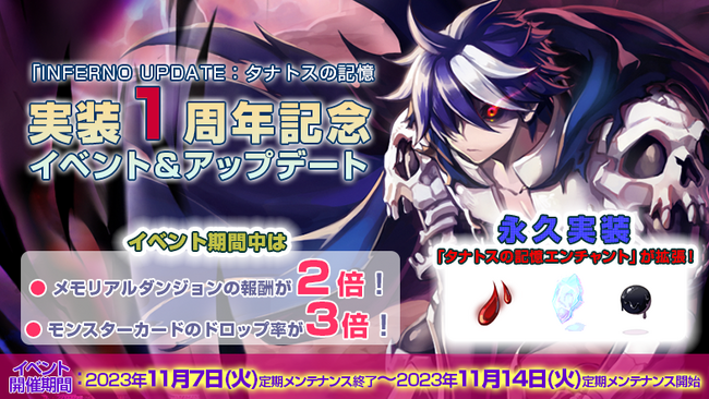 職業毎に強力な効果を発揮する「タナトスの記憶アクセサリー」シリーズを強化できる「タナトスの記憶エンチャント」が拡張されました。さらに、「INFERNO UPDATE:タナトスの記憶」1周年を記念して、2023年11月14日(火)定期メンテナンス開始までの間、「タナトスの記憶」のクリア報酬が2倍、対象のモンスターカードのドロップ率3倍になるイベントも同時に実施されます。
