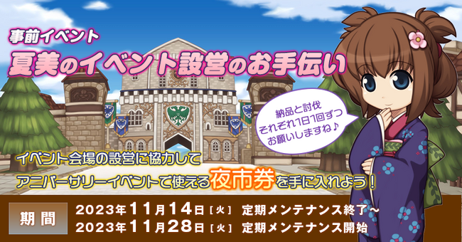 そんなアニバーサリーイベントの開催を記念して、2023年11月14日(火)定期メンテナンス終了から2週間、事前イベント「夏美のイベント設営のお手伝い」を開催いたします。アニバーサリーイベントの準備を進める夏美からの依頼を受けて、設営のお手伝いをしちゃいましょう。依頼を達成すると、お礼としてBase&Job経験値と、アニバーサリーイベントで利用できる「夜市券」を受け取れます。事前イベントに参加して、21周年のお祭りをガッツリ盛り上げていきましょう!