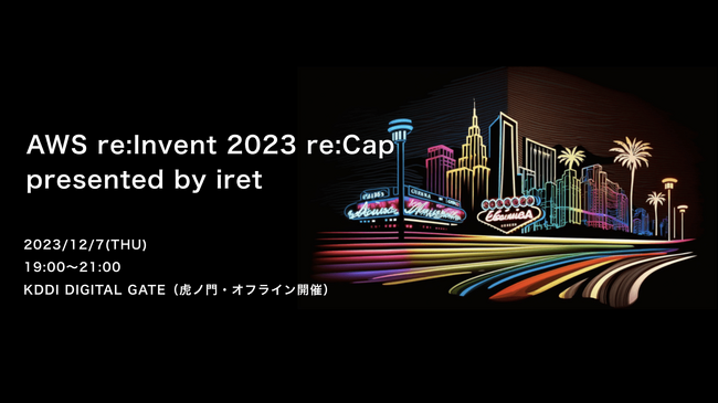 システム・アプリケーションの開発、グラフィック・UI/UX デザイン制作からインフラの構築・運用までをワンストップで提供するアイレット株式会社(本社:東京都港区、代表取締役社長:岩永充正、以下 アイレット)は、アマゾン ウェブ サービス(以下 AWS)が主催する最大級のグローバルイベント「AWS re:Invent 2023」について解説するセミナー「AWS re:Invent 2023 re:Cap presented by iret」を12月7日 (木) に KDDI DIGITAL GATE 虎ノ門にて開催します。本セミナーでは、アマゾン ウェブ サービス ジャパン合同会社の尾崎周也氏、KDDIアジャイル開発センター株式会社(以下 KAG)から御田稔(みのるん)氏、笹子義弘氏を特別ゲストに迎え、「AWS re:Invent 2023」にて発表された AWS の最新情報をいち早くご紹介します。