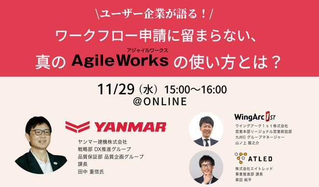 本セミナーでは、シリーズ累計4000社以上が導入しているワークフローシステム「AgileWorks」の隠れた魅力やさらなる活用方法について、特別ゲストのヤンマー建機様にご登壇いただきディスカッションを交えてご紹介!