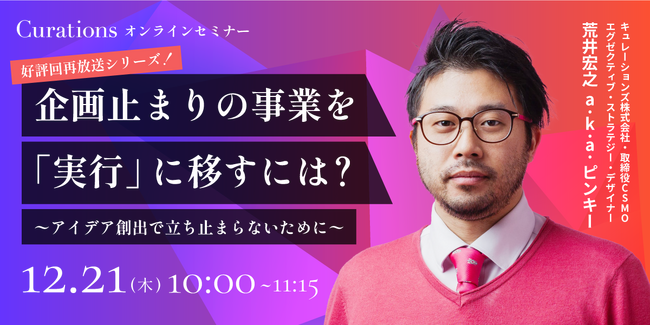 顧客企業のビジネス変革を成功に導くキュレーションズ株式会社(本社:東京都渋谷区、代表取締役社長:根本隆之、以下当社)は、『企画止まりの事業を「実行」に移すには?~アイデア創出で立ち止まらないために~(好評回再放送シリーズ!)』を2023年12月21日(木)に開催いたします。