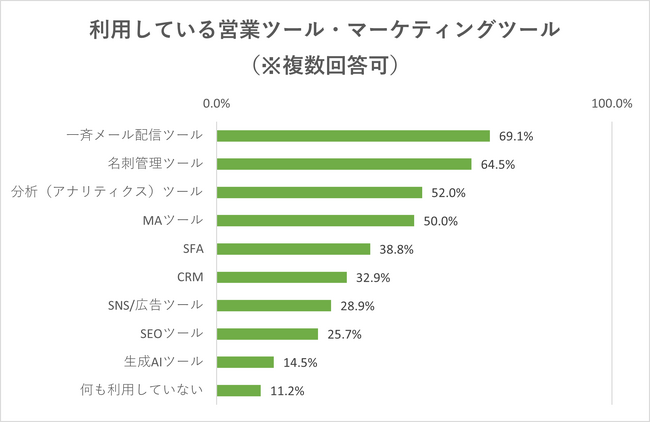 約9割の企業で何らかの営業・マーケティングツールを利用中、一斉メール配信ツールは7割近く、名刺管理ツールは6割以上が利用