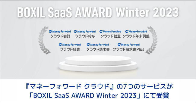 株式会社マネーフォワードが提供するバックオフィスSaaS『マネーフォワード クラウド』は、スマートキャンプ株式会社(以下「スマートキャンプ」)が主催する「BOXIL SaaS AWARD Winter 2023」において、『マネーフォワード クラウド会計』『マネーフォワード クラウド給与』『マネーフォワード クラウド勤怠』『マネーフォワード クラウド年末調整』『マネーフォワード クラウド経費』『マネーフォワード クラウド請求書』『マネーフォワード クラウド請求書Plus』の7つのサービスで選出されました。