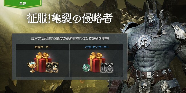 期間中、毎日12時と20時に、アデン大陸各地に出現する「亀裂の侵略者」を討伐時、追加報酬として「侵略者のプレゼント箱(イベント)」を獲得できます。