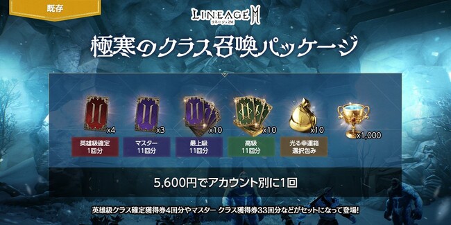 「不滅のマスター クラス獲得券(11回)(刻印)」3個、「不滅の最上級クラス獲得券(11回)(刻印)」10個、「不滅の英雄級クラス確定獲得券(1回)(刻印)」4回」などがセットになった「極寒のクラス召喚パッケージ」が登場しました。