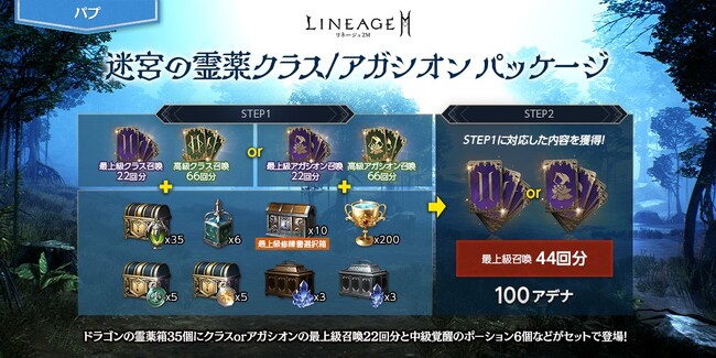 「ドラゴンの霊薬箱(刻印)」35個に、クラスまたはアガシオン最上級召喚22回分と、高級召喚66回分に、「中級覚醒のポーション(刻印)」6個、「ドラゴンの最上級修練書選択箱(刻印)」10個などがセットになった「迷宮の霊薬クラス/アガシオン パッケージ」が登場しました。