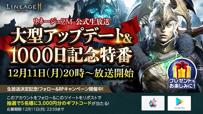 リネージュ2M 公式生放送配信決定を記念して、抽選で5名様に3,000円分のギフトコードをプレゼントするフォロー&RPキャンペーンを実施します。