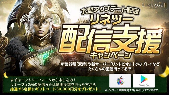 YouTubeで10分以上、リネージュ2Mのプレイ配信・動画投稿を行っていただいたユーザー(※注1)の中から抽選で5名様にギフトコード30,000円分をプレゼントします。