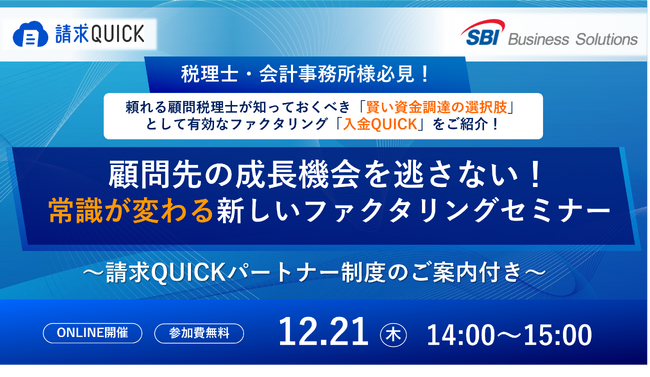 総合フィンテックソリューション企業であるSBI FinTech Solutions株式会社の子会社で、バックオフィス支援サービスを提供するSBIビジネス・ソリューションズ株式会社(本社:東京都港区、代表取締役社長:夏川 雅貴、以下「当社」)は、SBI FinTech Solutions 株式会社(本社:東京都渋谷区、代表取締役社長:金子 雄一、以下「SBI FinTech Solutions」と、税理士・会計事務所様向けに「顧問先の成長機会を逃さない!常識が変わる新しいオンラインファクタリング「入金QUICK」セミナー」を12月21日(木)に開催しますので、お知らせいたします。