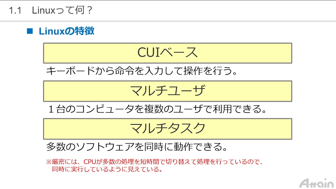 コンピュータートレーニング教材制作、eラーニング向けコンテンツ制作のアテイン株式会社(本社:東京都千代田区、電話:03-3255-4721、代表:本多成人、資本金:1億1470万円)は、月額2,800円(税込)で様々な動画講座が視聴し放題のクラウドeラーニングサービス「動学.tv( (リンク ») )」に、Linuxの基本操作と基礎知識がわかる「Linux基礎」eラーニング講座を、12月25日に公開します。