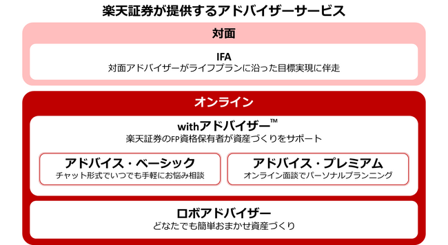 このたび提供開始する「withアドバイザー(TM)」は、ファイナンシャルプランニングなどの資産づくりに関する資格を有する楽天証券の社員がアドバイザーとして、チャットやオンライン面談を通じて、お客様が抱える資産づくりに関する課題やお悩みを解決するためのサービスです。楽天証券社員のアドバイザーがお客様のお悩みにあわせ、オンライン面談で、お客様の資産額やニーズにあわせたパーソナルプランニングを提案する「アドバイス・プレミアム」と、チャット形式でいつでも手軽にお客様の資産づくりのお悩みに対する最適なソリューションを提案する「アドバイス・ベーシック(ベータ版)」(※1)、2つのコースを提供します。本サービスの利用料は無料で、アドバイス後に取引する際の取引手数料やポイント進呈率など、楽天証券のネット口座での取引時と同様にご利用いただけます。