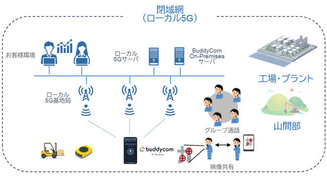 また、クラウドに接続できない山間部などにおいても、超高速、高いセキュリティを実現したコミュニケーションインフラにより、ユーザー数に制限のないグループ通話や現場状況のLIVE動画と音声による正確な情報共有などのBuddycomの機能が利用可能となります。