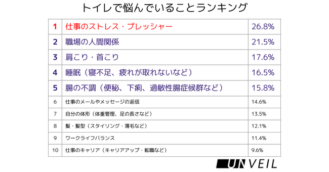 「1位:ストレス・プレッシャー(26.8%)」、「2位:職場の人間関係(21.5%)」、「3位:肩こり・首こり(17.6%)」、「4位:睡眠(寝不足、疲れが取れないなど)(16.5%)」、「5位:腸の不調(便秘、下痢、過敏性腸症候群など)(15.8%)」が上位5つにランクインしました。トップ10までを見ると、仕事関連のストレスが5個と過半数となっており、仕事関連の悩みをトイレ内で悩んでいることがわかりました。