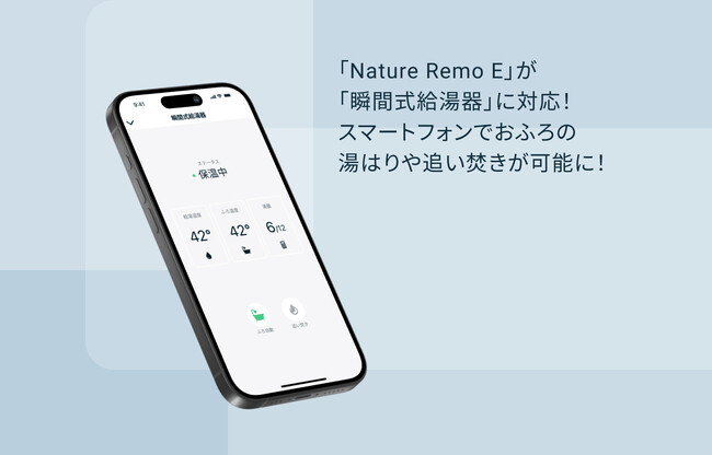 「自然との共生をドライブする」をミッションに掲げるNature株式会社(所在地:神奈川県横浜市、代表取締役:塩出 晴海、以下「Nature」)は、2023年12月14日(木)にスマホHEMS「Nature Remo E(ネイチャーリモイー)」をアップデートし、「瞬間式給湯器」に対応しました。スマートフォンの「Nature Remoアプリ(以下、本アプリ)」でおふろの湯はりや追い焚きなどの操作が可能になります。