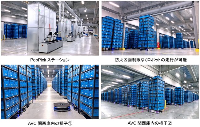 PopPickは、ギークプラス社の新製品で、物流センター内における注文された商品を注文ごとに集品する「ピッキング作業」の工程に向けたソリューション設備です。在庫商品は、折り畳みコンテナを高さ約3.8メートル、縦に10段積んだ棚に高密度に保管されています。受注データを受信するとロボットがPopPickステーションと呼ばれる作業員の定点作業位置まで棚を搬送します。次に、PopPickステーションは出荷する商品の入ったコンテナを棚から取り出し作業員の手元まで自動搬送します。最後に、作業員が手元に届いたコンテナから必要個数を出荷コンテナにとりわける作業のみを定点で行います。このたび、AVC 関西に318台導入し、第1期として246台を12月21日から稼働開始します。(第2期として2024年春に72台稼働開始予定)