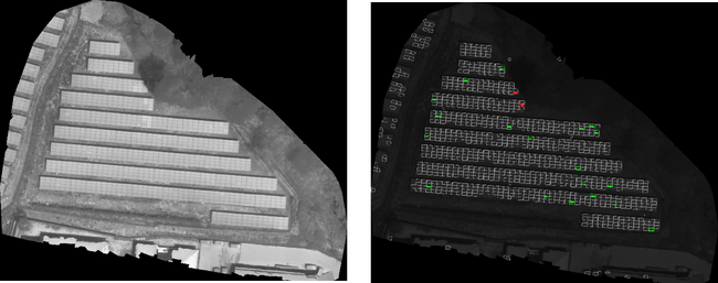 「Ridge Inspection for Solar Panel」では、ドローンで撮影した太陽光パネルの赤外オルソ画像(※)を利用して、ホットスポットと呼ばれるストリング異常、クラスタ異常、セル異常の疑いのある箇所をAIで検出します。解析結果オルソ画像は、モジュールを矩形で描画し、異常の種類で色分けを行い、ホットスポットの位置・種類がわかる解析結果画像を出力します。人の目で確認・検知する場合と比べて、はるかに高精度な異常検出が可能となり、作業の効率化も図れます。