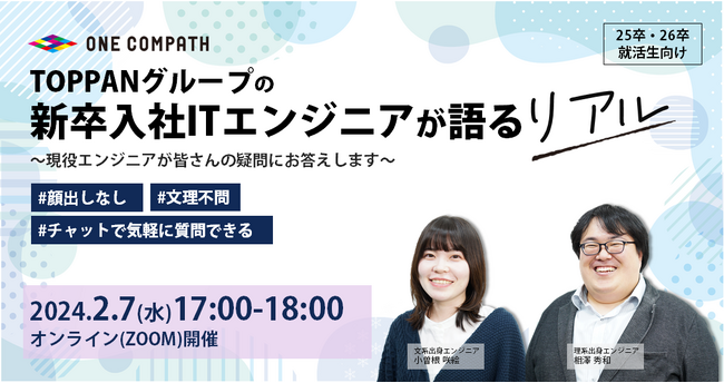TOPPANグループの株式会社ONE COMPATH(ワン・コンパス)は、新卒入社の現役エンジニアが本音で語る新卒就活生向けのオンラインMeet Up「TOPPANグループの新卒入社ITエンジニアが語るリアル~現役エンジニアが皆さんの疑問にお答えします~」を2月7日(水)に開催します。2025年卒以降のエンジニア職に興味のある学生の方を対象とします。なお、本イベントは当社の文系出身エンジニアと理系出身エンジニアが日々の業務やよくある1日のスケジュール、適性や必要なスキルについてお話ししつつ、参加者からチャットでいただいた質問にリアルタイムで回答します。