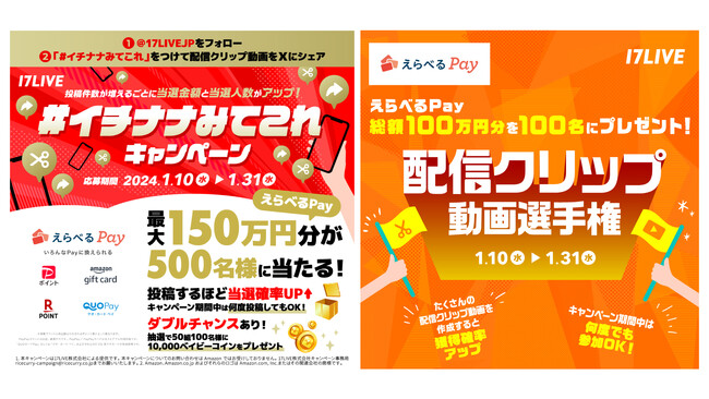 本キャンペーンは、「配信クリップ機能」を利用してアプリ内でシェアした動画の中から再生回数上位の方に、総額100万円分の“えらべるPay”をプレゼントする「配信クリップ動画選手権」と、「配信クリップ機能」で作成した動画をX(旧Twitter)にて指定のハッシュタグをつけてシェアいただいた方の中から抽選で、最大で総額150万円分の“えらべるPay”をプレゼントする「#イチナナみてこれ キャンペーン」の同時開催となります。いずれのキャンペーンも、期間中何度でも参加することが可能で、投稿する回数やクリップする回数が増えると当選確率がアップする仕様となっています。