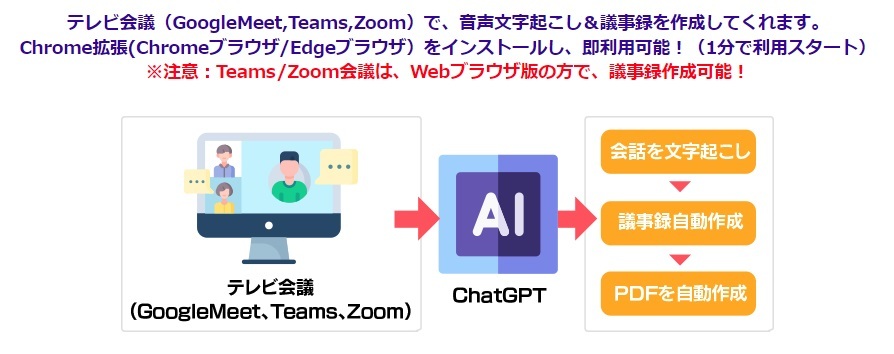 なお、Teams/Zoom会議は、Webブラウザ版で作成可能です。また、Teamsテレビ会議で議事録作成AIを利用する場合は、管理者の方の設定が必要です。