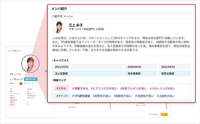 これまでも、蓄積したデータを複合的に確認しながら、各社員の経験やスキル、志向などを把握できましたが、今回追加された新機能により、各種人材情報を生成AIに読み込ませ、自動生成した社員一人ひとりの特徴を一目で確認することが可能になりました。