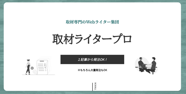 株式会社Webライタープロ(本社:東京都目黒区、代表:藤倉大地)は取材特化の記事制作サービス「取材ライタープロ」( (リンク ») )を開始いたしましたので、お知らせします。