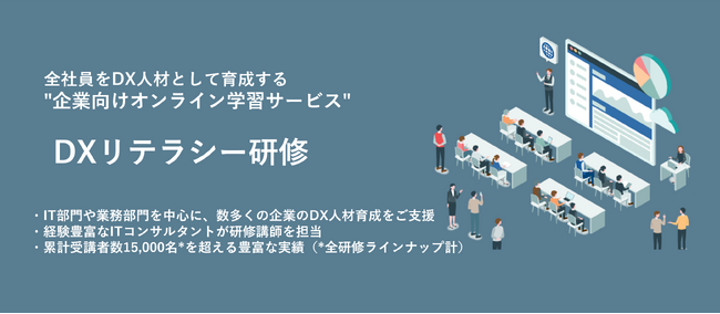 このような背景を踏まえ、当社では「DXを推進する上で全社的に啓蒙すべきマインド・スタンスや知識・スキルの習得」を目標とした企業向けオンライン学習サービス『DXリテラシー研修』の提供を開始いたしました。