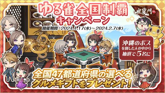 キャンペーン期間中、「ゆる雀」をプレイして沖縄のボスを倒した方の中から抽選で5名様に、3,000円相当の全国47都道府県のグルメが選べる「47都道府県グルメカード」をプレゼントいたします。
