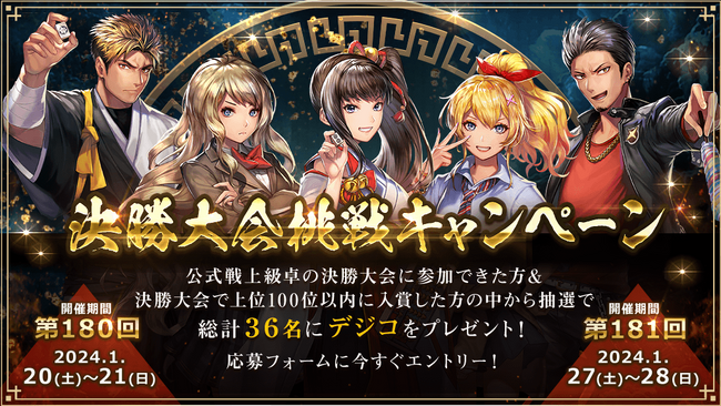 公式戦上級卓で開催される、第180回、第181回いずれかの四麻/三麻決勝大会「雀龍門杯」に参加できた方の中から、抽選で12名様に500円分のデジタルギフト「デジコ」をプレゼントいたします。
