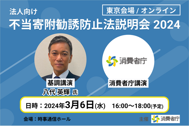 消費者庁は、法人等による寄附の不当な勧誘の防止等に関する法律(不当寄附勧誘防止法)についての説明会を東京会場とオンライン配信で開催します。