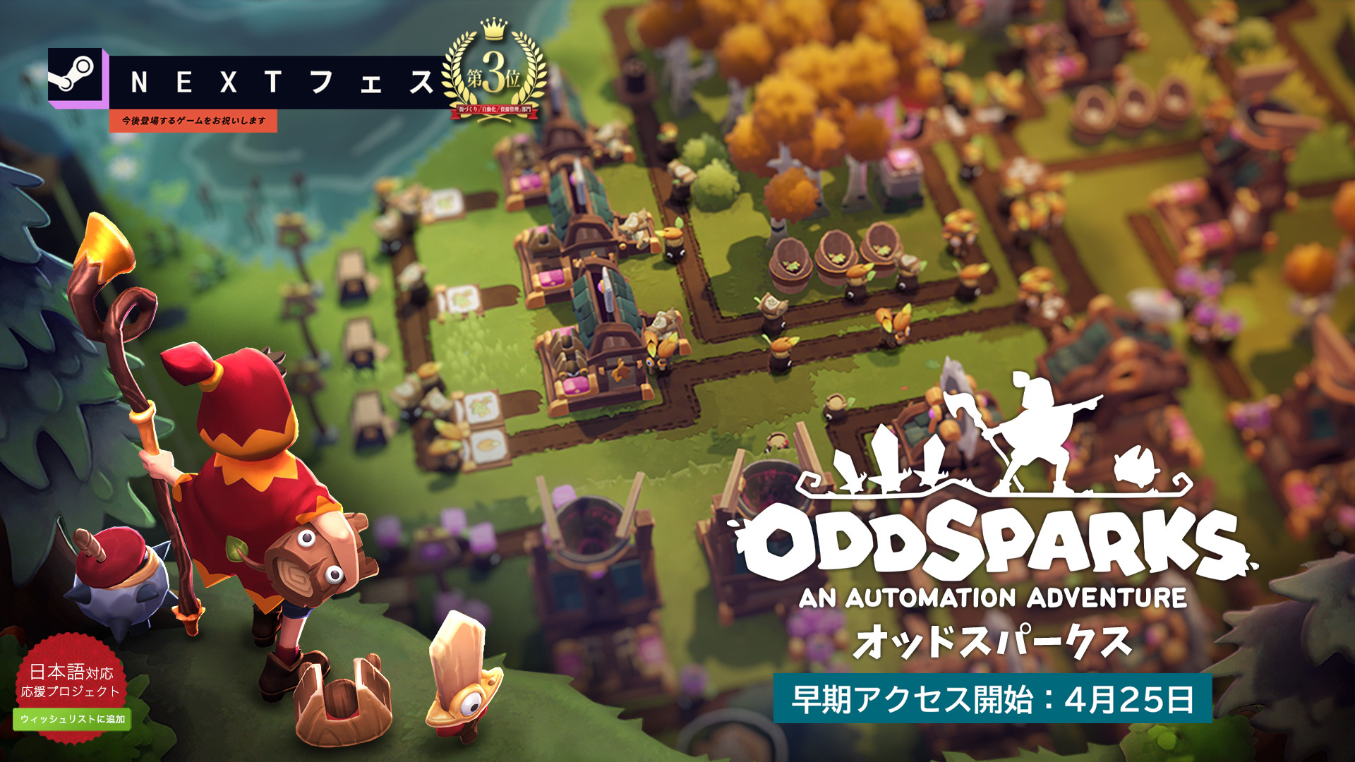 工場自動化・世界探索ゲーム『Oddsparks: An Automation Adventure(オッドスパークス:オートメーション アドベンチャー)』は、「Steam Nextフェス:2024年2月のイベントで最もプレイされた体験版」にて、「街づくり」「自動化」「資源管理」の3部門で3位を獲得しました。本作は、2024年4月25日(木)に早期アクセスが開始されます。