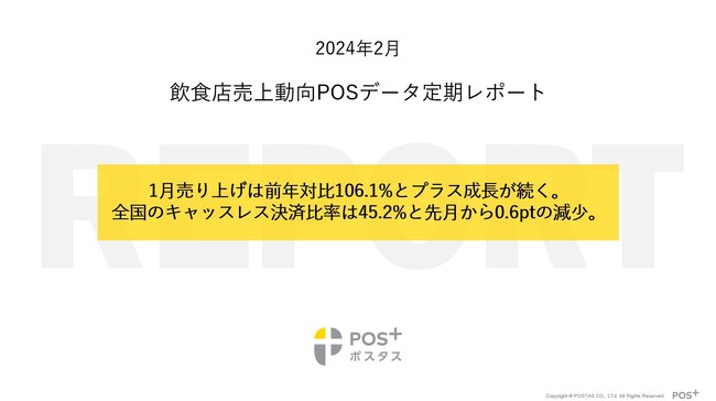 「はたらいて、笑おう。」をビジョンに掲げるパーソルグループでクラウド型モバイルPOSレジの「POS+(ポスタス)」を提供するポスタス株式会社(本社:東京都中央区、代表取締役社長:本田 興一、以下:ポスタス)は、2024年1月度の飲食店売上動向についてPOSデータを基に集計し、結果をとりまとめましたので本日公開します。