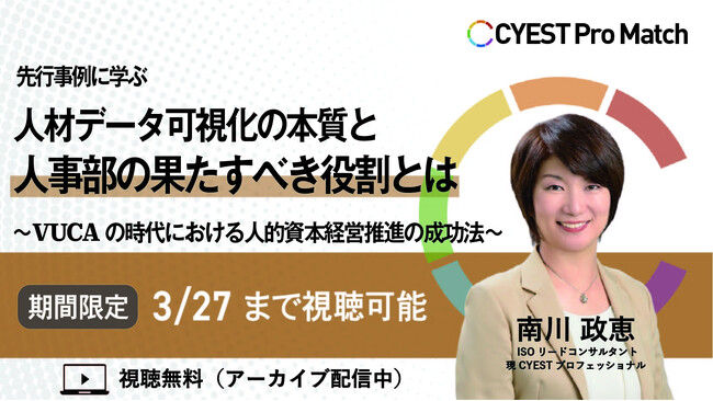 グローバルなビジネス経験を有する5,000名超のプロフェッショナルの中からグローバルマネジメントに専門性を持つ経営人材の経験と知見を活用した経営支援サービス「CYEST プロマッチ」を手掛けるサイエスト株式会社(本社:東京都港区、代表取締役:北村嘉章、以下当社)は、人的資本経営による企業価値向上の秘訣について、日立化成本社人事部門初の女性部長を務めた現ISOリードコンサルタントの南川氏の解説動画を無料公開します。