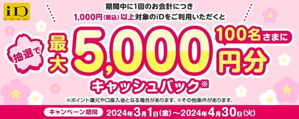 本キャンペーンは期間中に、電子マネー「iD」(以下、iD)を1回のお会計につき1,000円(税込)以上のご利用を1口として、抽選で100名さまに最大5,000円分を還元いたします。キャンペーン参加にあたり、エントリーは不要です。なお、iDがご利用可能なすべての店舗でのお支払いが対象(※1)となります。詳細はキャンペーン特設Webサイトをご確認ください。